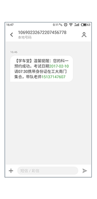 预约成功之后,考试出发前一天会收到学车堂发送的关于考试相关事宜的短信